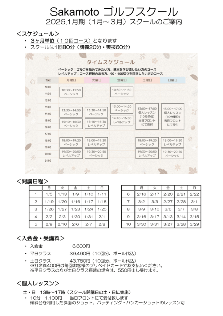 ・フロントにて1月期(1月~3月)のスクール新規申込受付中!